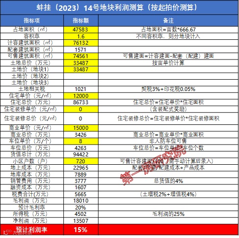根据测算,蚌挂(2023)14号地块利润达到15%,利润空间较大。