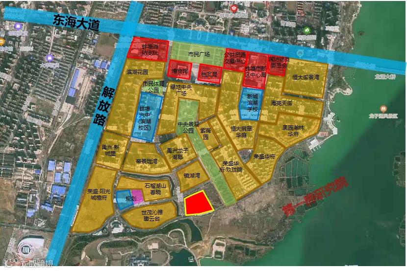 龙子湖西岸的滨湖板块是蚌埠重点规划发展的片区,该片区位于东海大道以南,解放路南段以东,龙子湖以西,面积约为5平方公里,从图示可以看出,板块已经基本开发完全。该片区因地理区位优越,周边景观资源突出,汇集了众多优质高端改善项目,如荣盛华府、奥园翰林华府、石榴湖山春晓、荣盛阳光城·檀府以及世茂沁雅瞰云台等。而从下图可以看出,剩余可开发的地块已然不多。