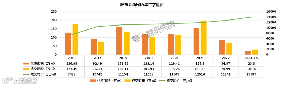 2018年起,肥东县商品房市场成交量价总体呈稳定态势;2021年上半年,受合肥市区带动,成交量继2016年后再创新高;伴随全国市场大环境下行,作为合肥卫星城市的肥东众多板块属于城市边缘板块,叠加新站、瑶海、经开新桥放开限购,肥东市场遇冷明显,但历年成交均价稳步上扬。肥东县近7年新房年均供应123.33万㎡,年均成交125.06万㎡,需求大于供应。