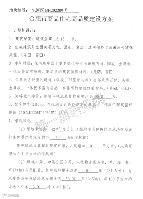 从保利和光熙悦项目竞品质方案可以看出,规划设计55分,工程建设60分,开发企业5分,属于竞品质120分(满分)作品。项目建筑层高3.15米,绿地率42.01%,人车分流,绿建三星(绿色建材四类三星),装配率65%,应用空气能热水系统,应用空气能供暖、制冷,主体结构保险10年,安装、装修工程保险5年。