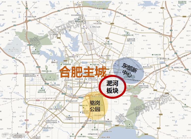 淝河板块定位为淝河片区中心,邻近一核四心中的“骆岗公园核心”、 一级城市中心东部新中心。靠近城市主城中心,属于城市外拓发展的新兴板块,同享主城配套。