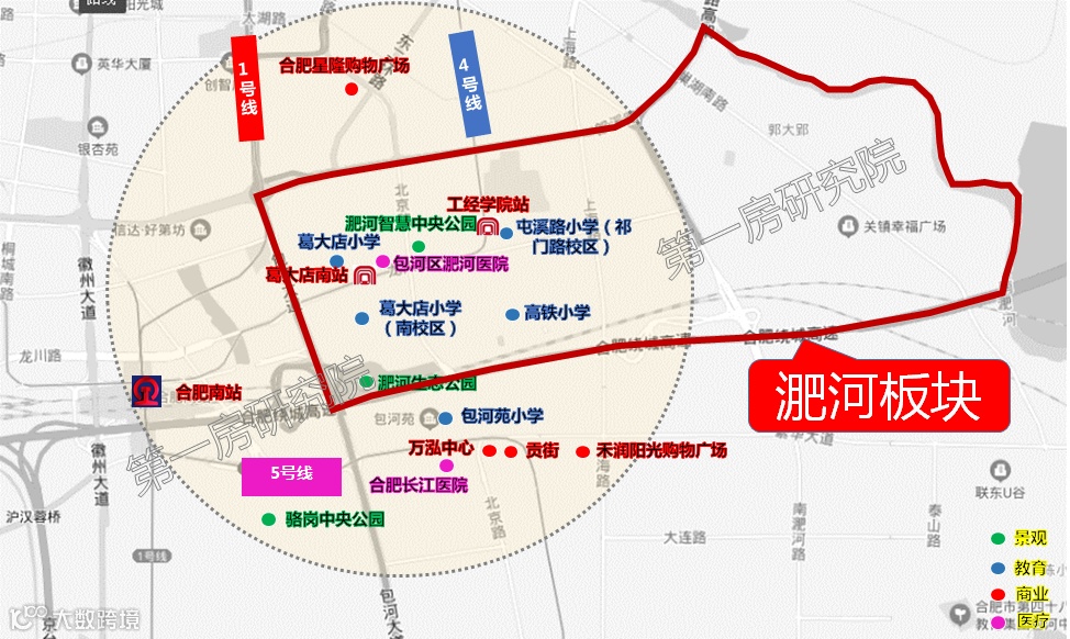 从板块配套上来看,淝河板块是一个集交通、景观、教育、商业、医疗于一体的板块,板块配套成熟。