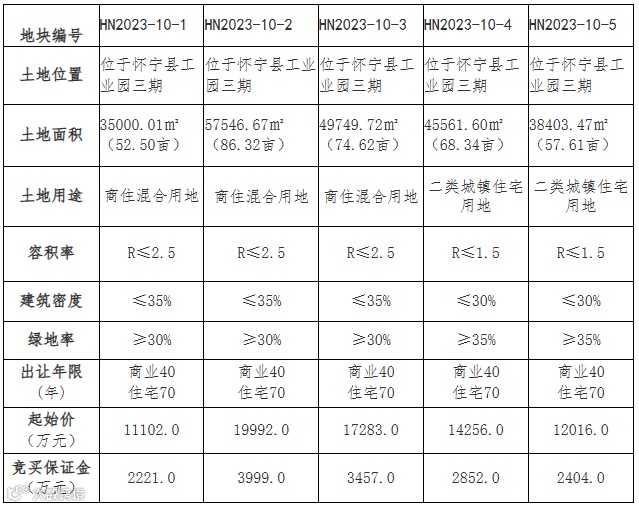备注:地块具体规划指标按怀宁县自然资源和规划局出具的规划条件JGT2023012、JGT2023016、JGT2023017、JGT2023018、JGT2023019号执行;地块起始价不含契税、印花税;地块准确面积以测绘部门提供的宗地图为准;地块其他出让信息以出让文件为准。