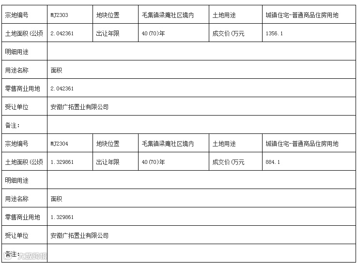 淮南毛集实验区国土资源局国有土地使用权招拍挂出让成交公示