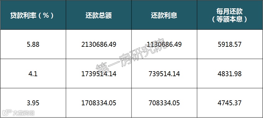 按照3.95%的房贷利率,贷款100万,按揭30年,利息总额708334元,每月只需还款4745.37元。可见,实行新的首套房贷款利率之后,月均还款仅4745.37元/月,比以往5.88%利率时的5918.57元/月少了1173.2元/月。将会很大程度上降低偿债负担,从而在一定程度上刺激民众去购房。