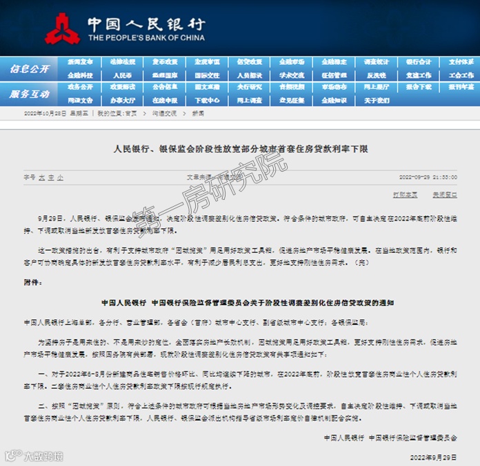 2022年9月29日,人民银行、银保监会发布通知,决定阶段性调整差别化住房信贷政策。符合条件的城市政府,可自主决定在2022年底前阶段性维持、下调或取消当地新发放首套住房贷款利率下限。