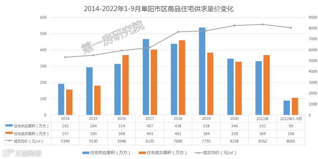 纵观这几年阜阳住宅市场的走势,自2019年之后,住宅成交量跌价涨。主要原因,阜阳自2019年之后货币化安置逐年下降,需求端减少使得成交量走低。2019年之后阜阳地王频出,地价上涨使得房价跟涨,同时也会“劝退”一部分资金实力相对薄弱的客户。2021年下半年,受整体市场大环境和疫情等影响,阜阳市场下行明显,但为了刺激楼市,提升市场士气,在同年11月发布了7000张为期45天的房票,故而去年楼市成交量在年底有了大幅的上涨,但从今年1-9月的成交量价表现上来看,房票刺激楼市也只能说是并未从“源头”解决问题,只会透支潜在需求。