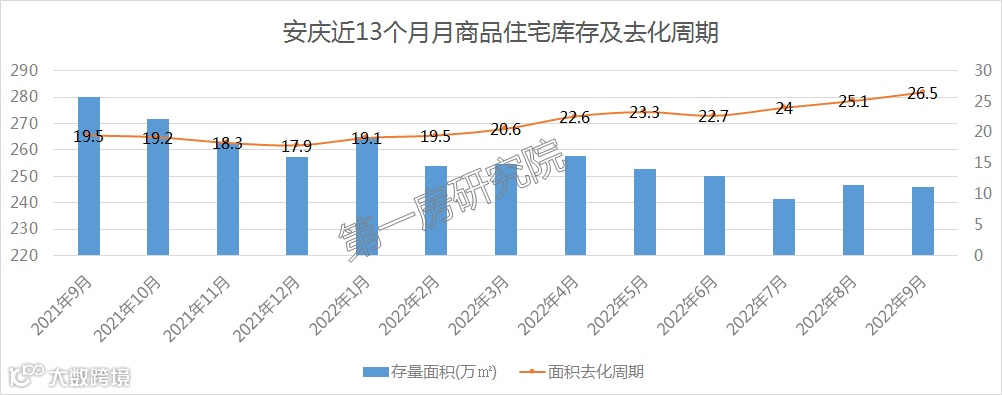 从安庆历年商品住宅量价趋势不难看出,属于供大于求的态势。从库存及去化周期不难看出,近13个月,存量稳定在257万㎡,约26332套,去化周期不断走高,也在侧面说明销售端不断走低。截至2022年9月底,存量去化周期约26.5个月(约2.21年),去化周期非常夸张。