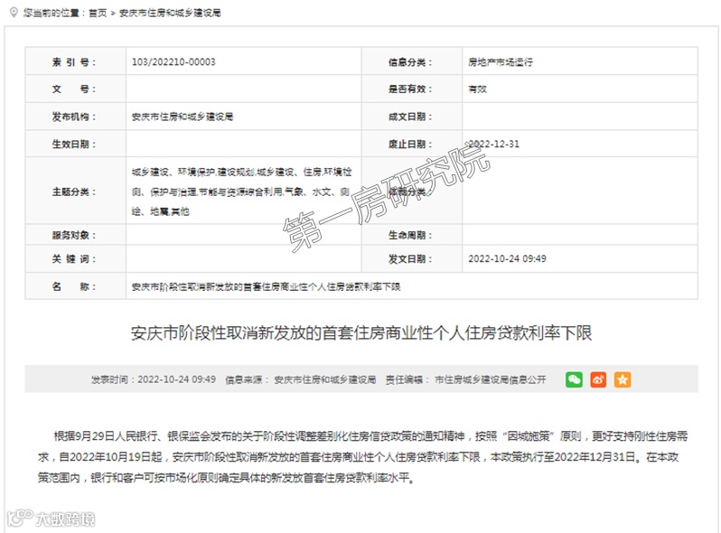 2022年10月24日,安庆出台了阶段性取消新发放的首套住房商业性个人住房贷款利率下限,银行和客户可按市场化原则确定具体的新发放首套住房贷款利率水平,政策执行至2022年12月31日,据了解,安庆现在的首套房利率最低也是3.95%。
