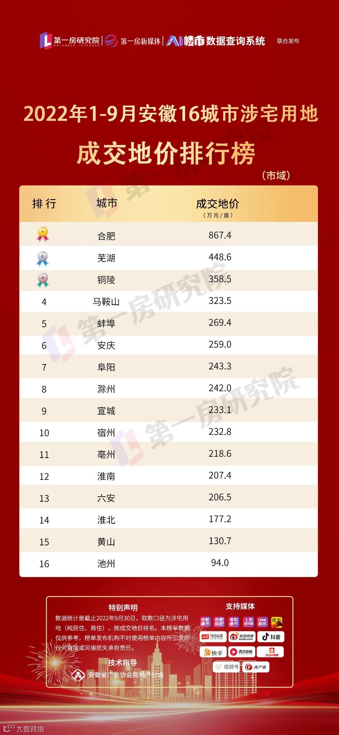 10月14日,由第一房研究院、第一房媒体、AI楼市查询系统联合发布的2022年1-9月安徽城市涉宅用地成交面积、涉宅用地成交金额、涉宅用地成交地价、涉宅用地成交率四大榜单正式发布。本次统计范围地市含下辖县,数据统计是截止2022年9月30日,取数口径为涉宅用地(纯居住、商住),按涉宅用地供应成交率排名。本榜单数据仅供参考,榜单发布机构不对使用榜单内容所引发的任何直接或间接损失承担责任。