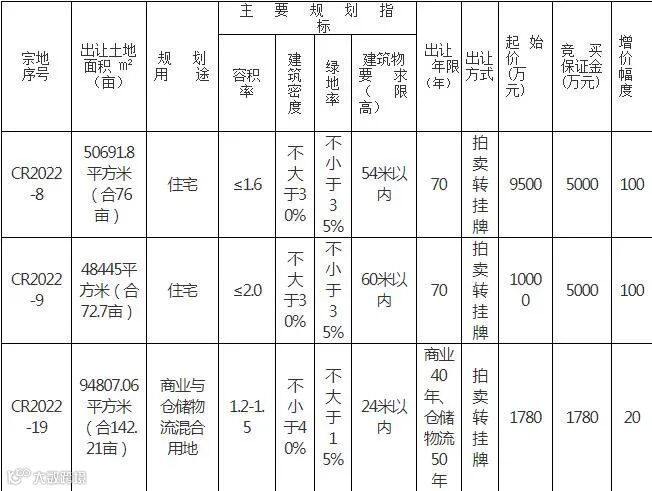 CR2022-8号、CR2022-9号、CR2022-19号宗地均以拍卖转挂牌方式公开出让,并设有底价,不达到底价不能成交。至拍卖竞买报名缴纳保证金截止