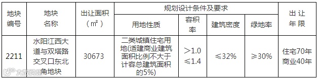 2211号地块,水阳江西大道与双塔路交叉口东北角,出让面积30673平方米,由宣城市国有资产投资有限公司以人民币307万元/亩竞得。