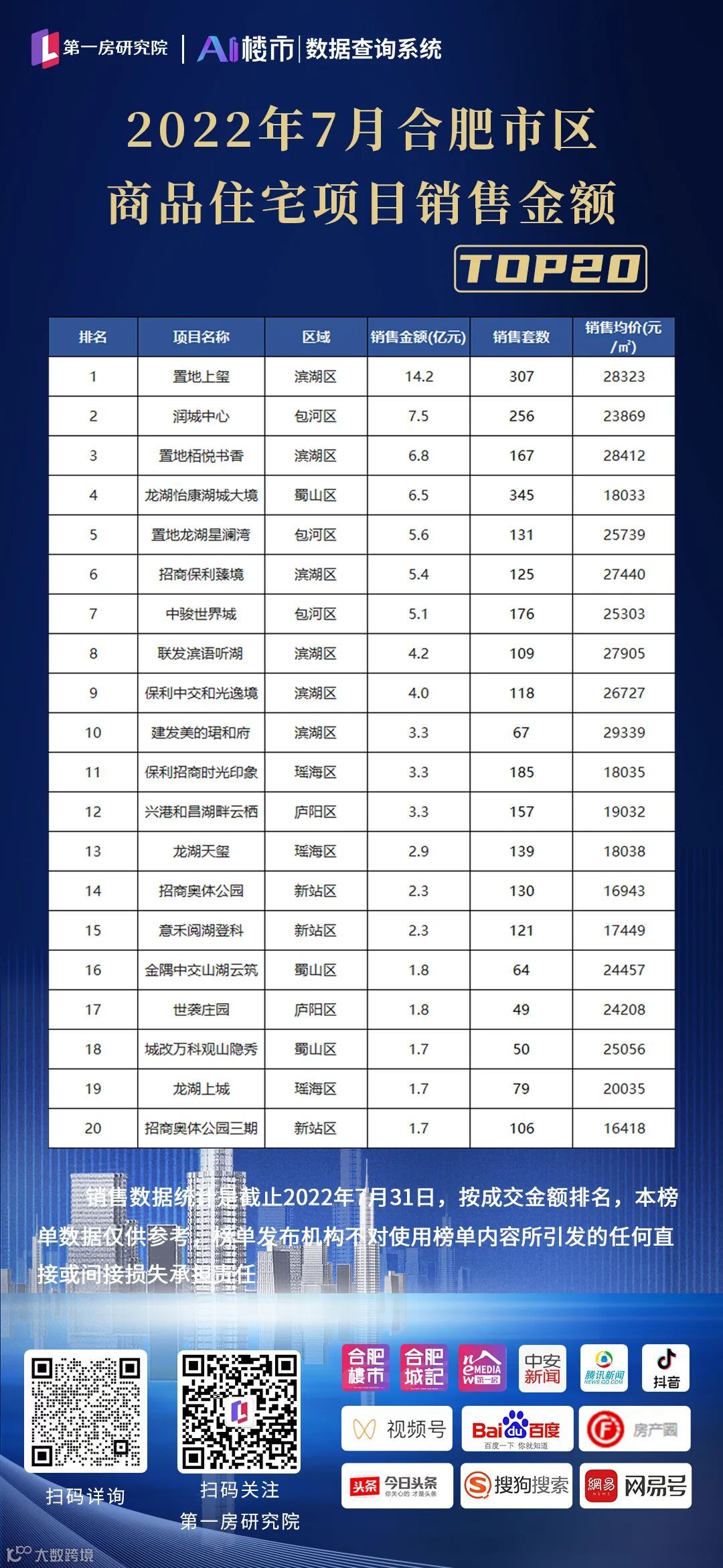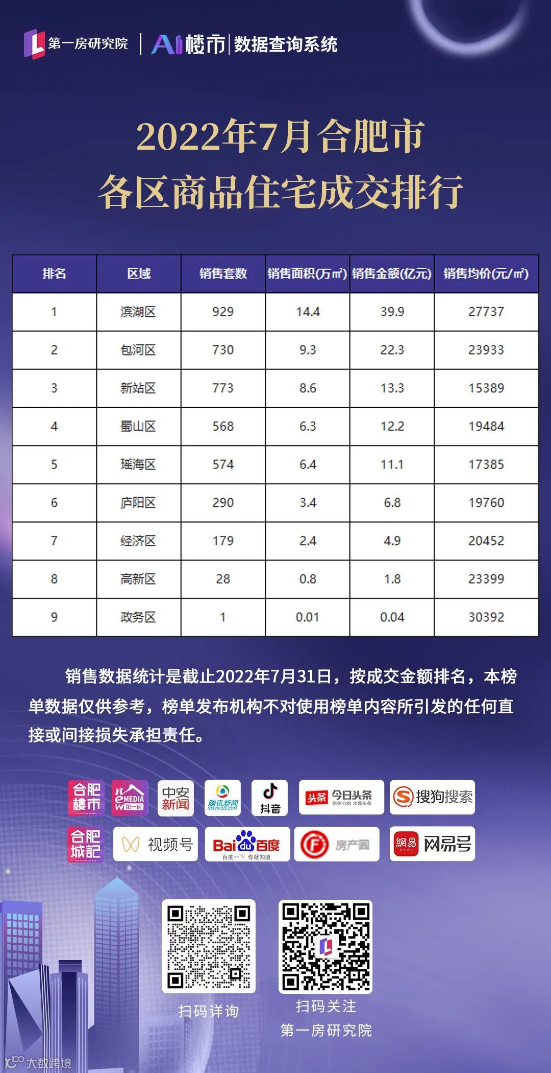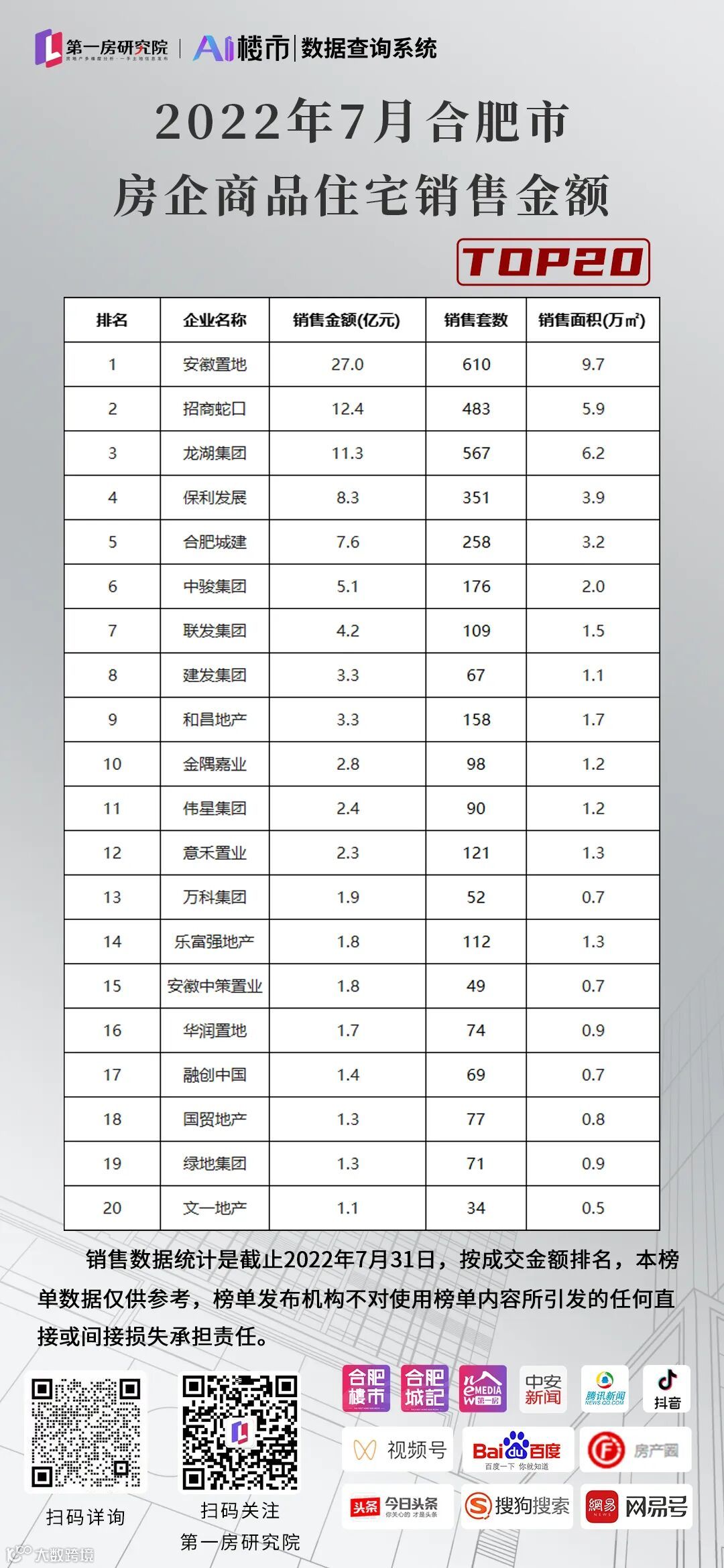 AI楼市大数据,合肥7月最新排行榜单发布,下面让我们一起来看看各区、各项目、房企TOP20情况!