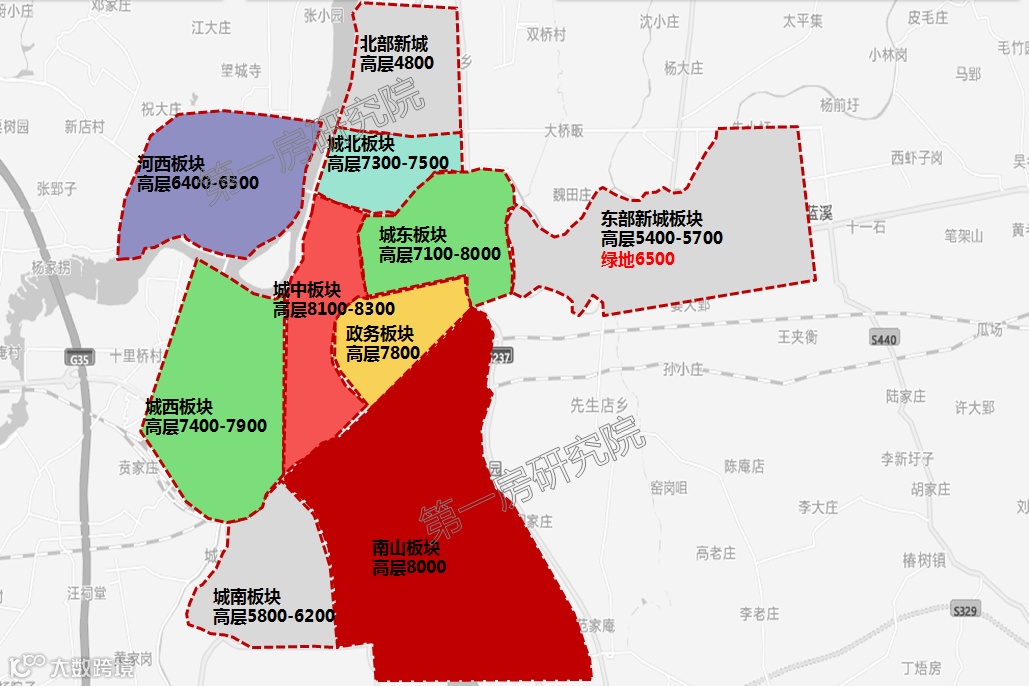 城市发展方向,靠近老城城东核心(政务)板块配套完善,客户认知较好;泛城东板块生活配套相对不足,客户认知相对较弱。