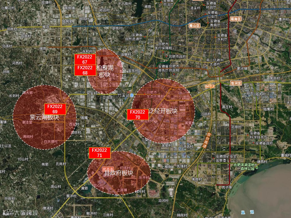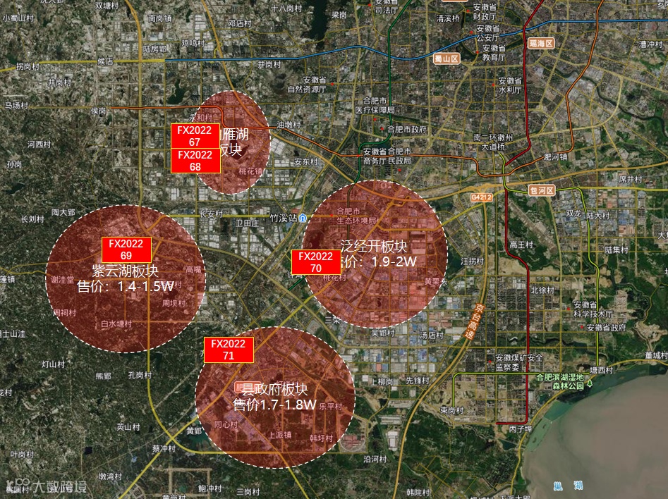 本次肥西出让五宗地块位置都比较优异,其中67和68号地块是位于柏雁湖板块,这里是肥西与高新共管的区域,所以这两宗地块后期代建的配套设施都要移交给柏堰科技园管委会,这个板块目前无新房在售,以前这边祥生和荣盛售价在1.6-1.7W,但二手房价格已经倒挂,基本在2.3W。而69号地块所在的紫云湖板块售价在1.4-1.5W,不过这个板块目前在售项目较少,整体生活氛围价差,所以价格也是整个肥西县的低谷所在;71号地所在的县政府板块项目售价在1.7-1.8W,而70号地块所在的泛经开这边相对就高许多了,新房售价在1.9-2W,尤其明珠广场附近的肥西经开区项目。