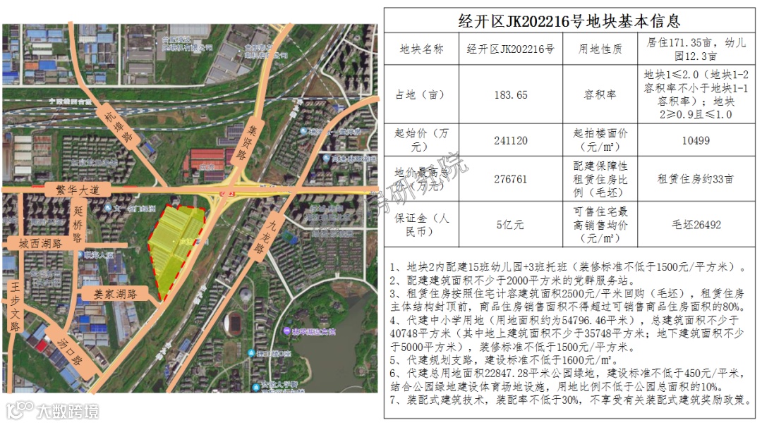 该地地块从去年10月份公示,历经4次挂牌,2次调整,但是遗憾的是一直流拍。2021年10月首次供地时,地块总面积243.42亩,其中商业用地13.97亩,幼儿园10.15亩,居住用地219.3亩,要求配建10%保障性租赁住房,居住用地起拍价为1414万元/亩,居住用地最高限价1555万元/亩,新建商品住宅毛坯限价19335元/㎡,可巨无霸地块最终因配置保障性住房、代建幼儿园及商业流拍。