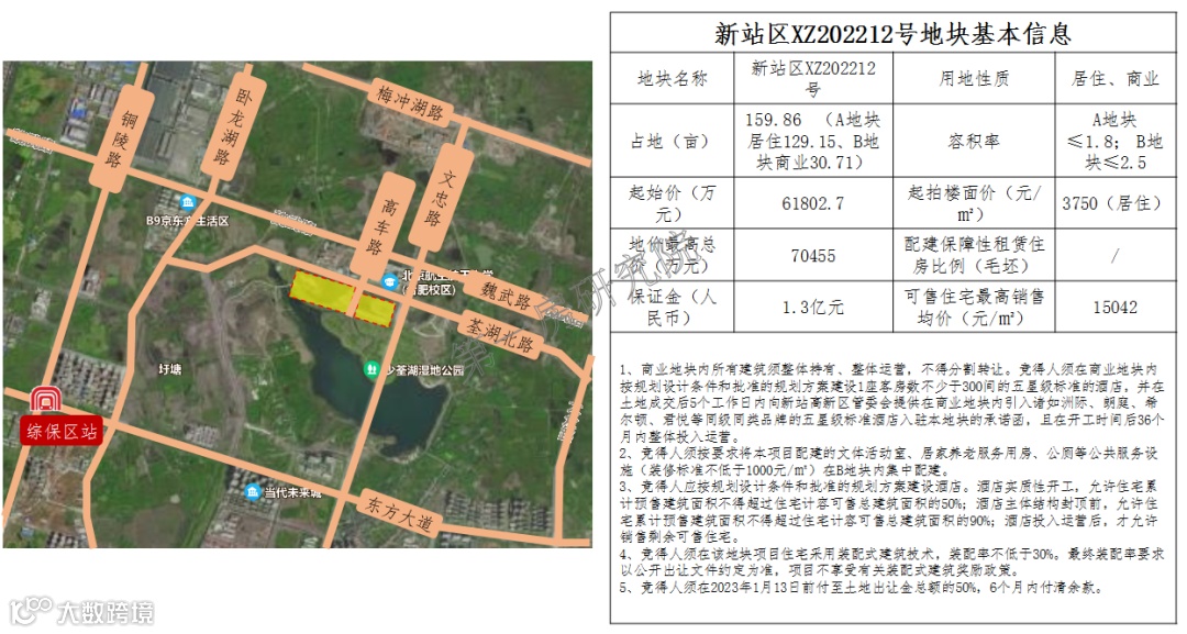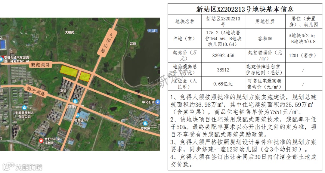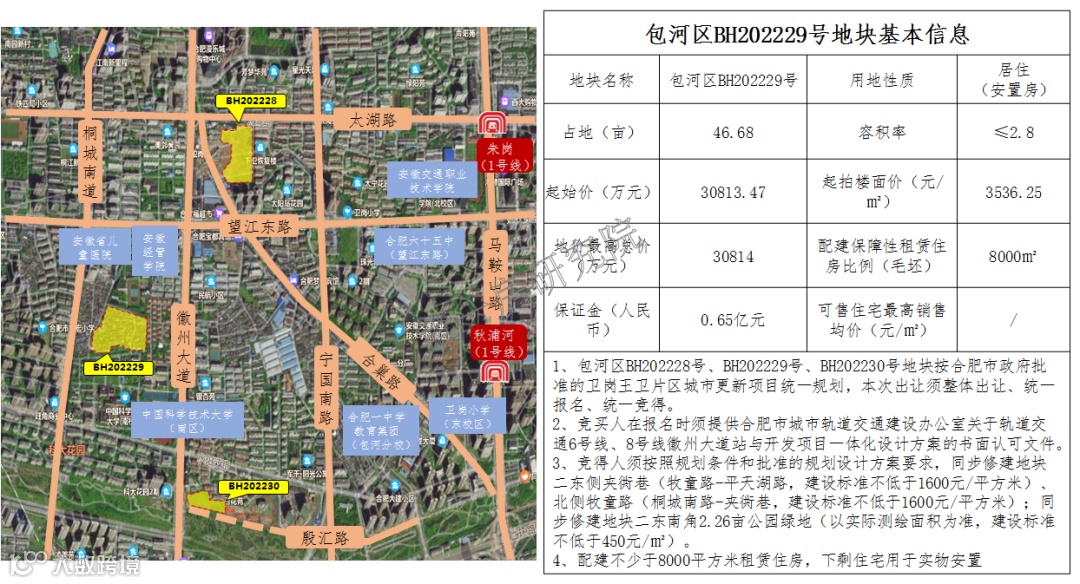 该两宗地块与另一宗包河区BH202229号安置房地块,是按合肥市政府批准的卫岗王卫片区城市更新项目统一规划,本次出让须整体出让、统一报名、统一竞得。该三宗地块在出让条件中有一些不常见的要求,故大概率会被滨投或者轨交公司竞得。