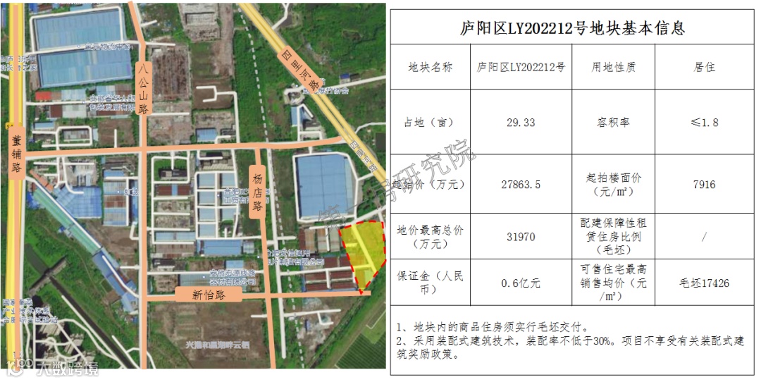 该地块是位于庐阳区的大杨镇板块内,夹在董铺湖水库和大房郢水库之间,这个板块配套能级较低,地块本身也没有特殊地方,不过他的毛坯限价17426元/㎡,比位置更北,在6月份被兴港和昌以满分竞品质拿下的庐阳区LY202208号地块的毛坯限价18535元/㎡下调了1109元/㎡,可想而知未来08号压力更大了。