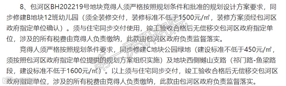 从公告可知,这些出让地块不单是纯居住地块,同时政府还提出了代建幼儿园、公园绿地以及城市道路等等公建设施的要求,这样的举措可见政府既想通过建设居住小区带来人气,同时要求代建来提高区域居民的居住舒适性和加快城市路网的建设。