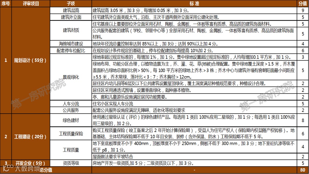调整前竞品质满分是120分,其中规划设计50分,工程建设65分,开发企业5分。调整后竞品质满分是80分,其中规划设计55分,工程建设20分,开发企业5分。主要涉及的调整是与装配式、精装修、地源热泵、空气源热泵等设备相关的几个成本大项取消了。