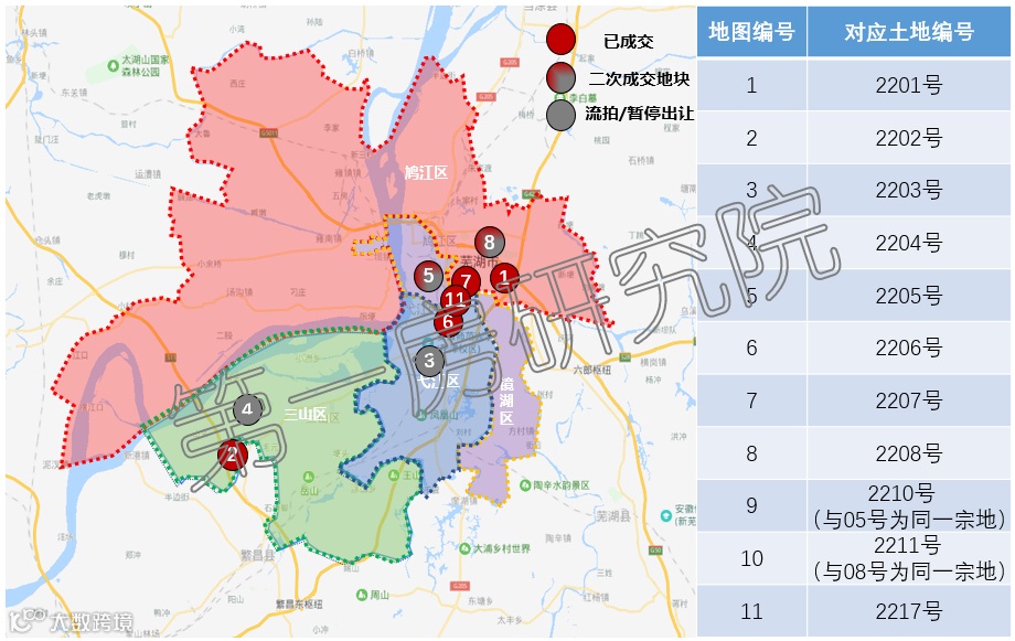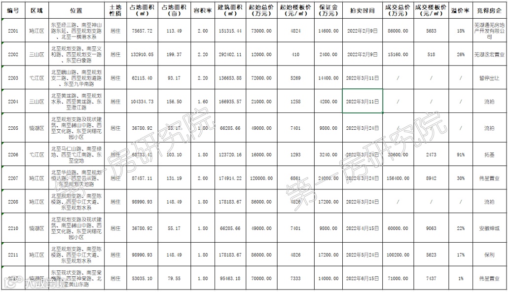 芜湖上半年实际供应涉宅用地9宗(2210号与2205号地块为同一宗地,2211号与2208号地块为同一宗地),大部分位于核心三区(鸠江区、镜湖区、弋江区)范围,因此房企拿地热情相对较高,只有2203号、2204号地块因区位偏僻,最终未能成交。