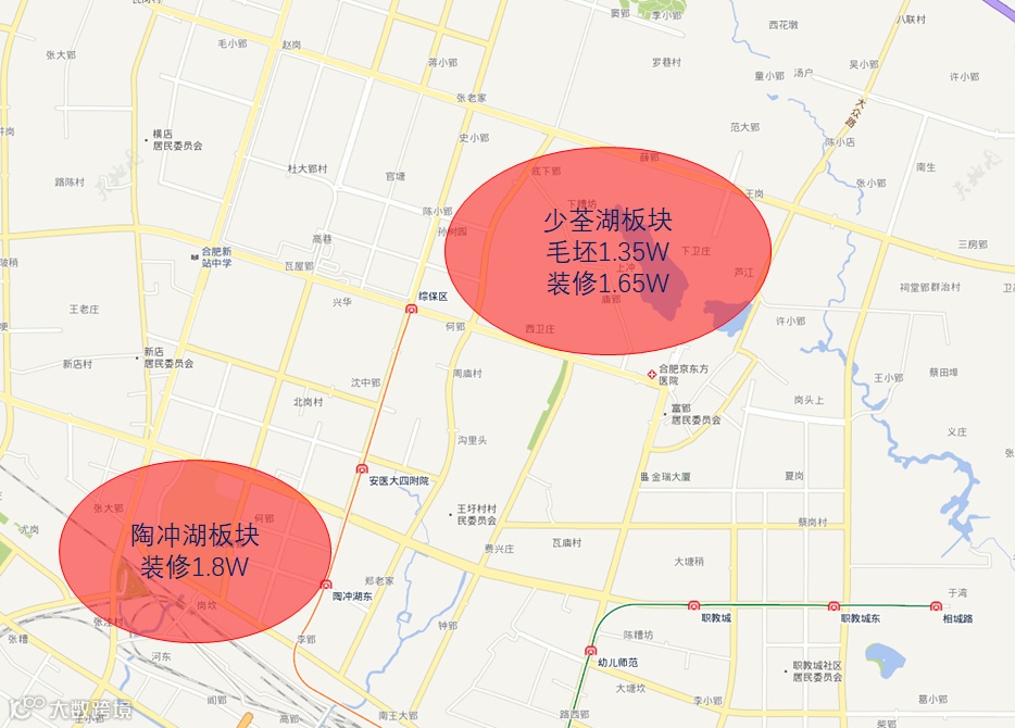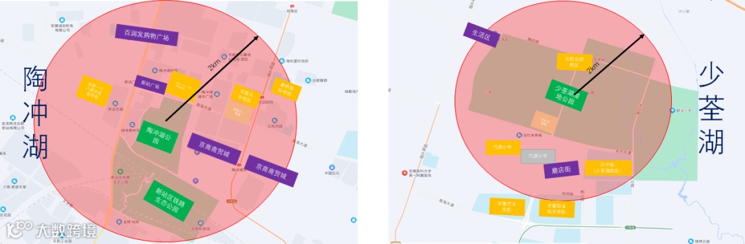 以两湖2公里范围内配套显示,陶冲湖周边配套完善,生活氛围浓厚,拥有安医大一附院、新站广场、一六八中学等优质生活学习配套,而少荃湖板块相对而言,配套能级较低,因此陶冲湖配套明显胜出一筹。