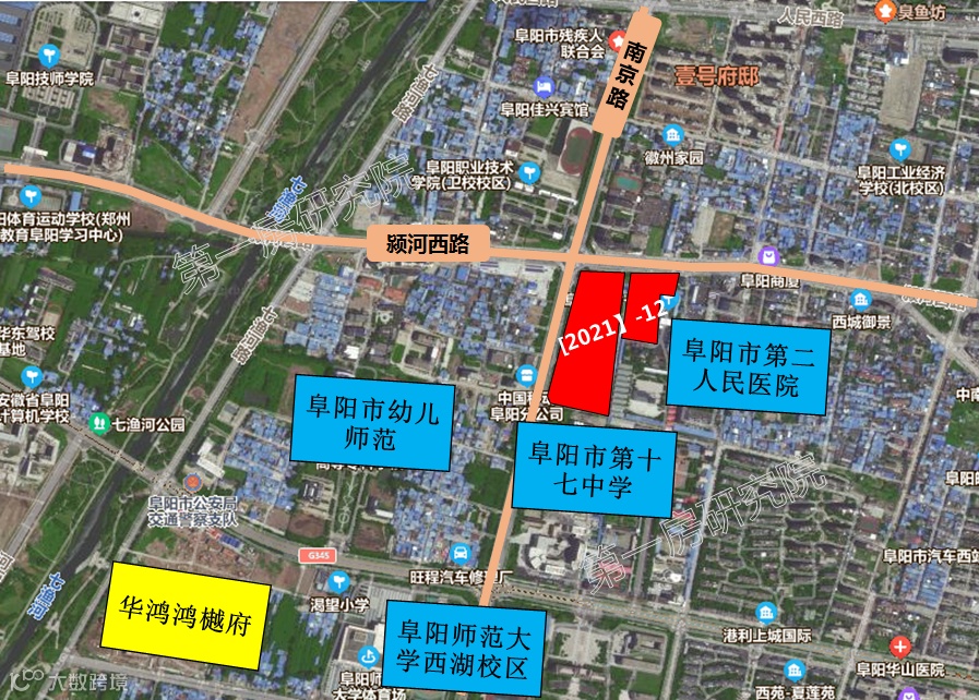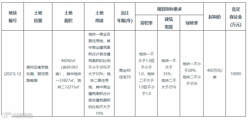 [2021]-12号地块位于颍州区南京路东侧、颍河西路南侧,(地块占地约69.063亩,容积率1.9,起始价31768.98万元,起拍单价460万/亩,起拍楼面价3632元/㎡;从地块指标上来看,地块体量和容积率偏低,适合做高层+洋房的梯度组合。