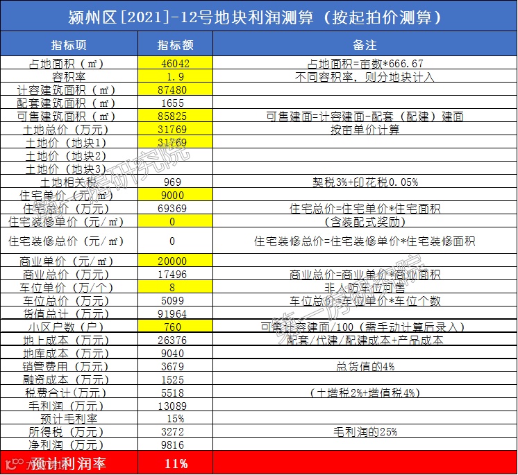 结合地块周边项目售价情况,按照地块起拍价测算,[2021]-12号地块利润率约11%,起拍价下的利润较高。