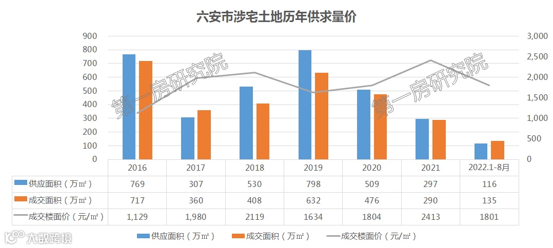 根据AI楼市大数据显示,六安2019年至今土地市场成交量逐年下降。2022年1-8月土地供应建面116万㎡,成交量135万㎡,成交楼面价1801元/㎡。