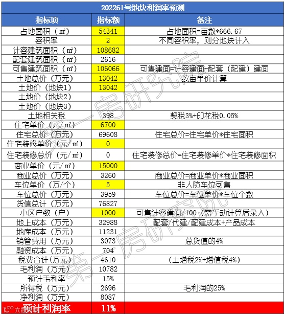 参考周边市场价格,按照高层毛坯6200元/㎡,洋房毛坯7200元/㎡(住宅均价约6700元/㎡),配套社区商业15000元/㎡,车位5万/个计算,在起拍价160万元/亩时,地块净利率达到11%。在起拍价下,该地块的利润空间还是比较可观的。