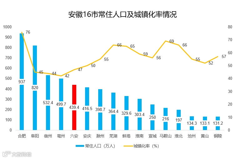 六安城市人口:根据安徽省公布的第七次人口普查结果,六安市常住人口439.4万,位列全省第五位,城镇化率47%,从人口基数以及城镇化率来看,未来六安楼市还有较大发展空间。
