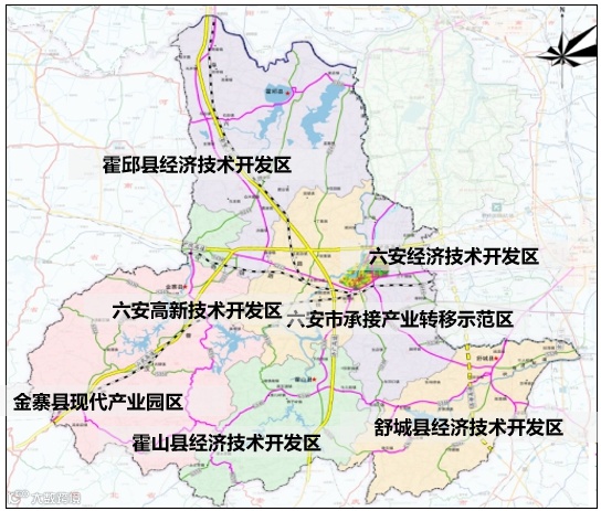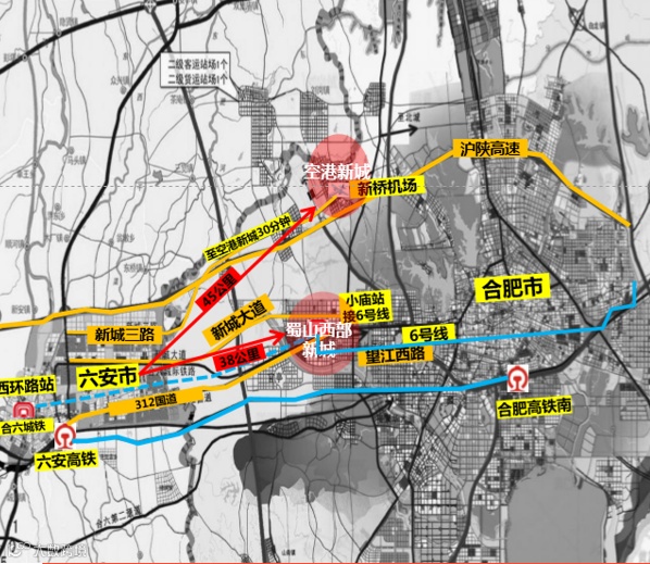 六安城市交通:融入合肥半小时经济生活圈,①公路规划七纵八横八联,目前有沪陕高速、沪蓉高速、济广高速、德上高速4大高速段,距合肥市区高速车程1.5小时。②目前合肥至六安高铁约30分钟,主要线路宁西铁路;六安到合肥城际高铁仍在规划中,建成后六安北站直接通往新桥机场约30分钟。③合六轻轨仍在规划中,通车后合肥到六安通行时间约18分钟,交通十分便捷,可在小庙站与合肥轨道交通6号线换乘。