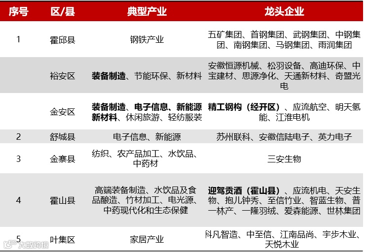 六安城市产业:装备制造、新能源新材料、电子信息产业较强,代表企业为长江精工钢构,迎驾贡酒两家上市企业。
