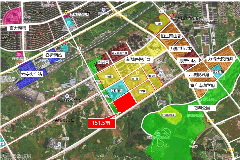 说到南山新区,大家首先想到的一定是去年六安的两个地王项目,远大豪掷15.74亿拿下六出2021-12号/六金出2021-13号地块(远大印澜山项目),成交楼板价分别为6482元/㎡,6556元/㎡,板块土地市场热度极高。南山新区作为六安市区宜居板块的天花板,区域内有着最完善的旅游休闲规划体系。凭借着规划的利好和绝对区位优势,使得该板块成为六安高净值人群的集聚地。目前南山新区新房库存为各区最少,仅两个高端盘远大印澜山和白鹭园壹号在售,板块新房市场供求健康,韧性较强。本次拟推介的南山新区地块就在吾悦广场附近,吾悦广场在21年10月已清盘。也就是说,目前该地块的小板块新房库存为0,而且吾悦广场已开业,会对周边的人口有个虹吸效果,加上地块东边拟建设城北小学,据说马上就要动工了。之前吾悦广场价格对比其他竞品便宜的主要原因是因为学区这个硬伤。大家都知道,城北小学属于六安市第一梯队小学,如果城北小学在吾悦广场住宅卖完之前落地,试想下他价格还会是去年那个成交价吗?所以买到吾悦华府的小伙伴就偷着乐吧。这么一分析,本次推介地块的周边市场安全边界是非常高的。