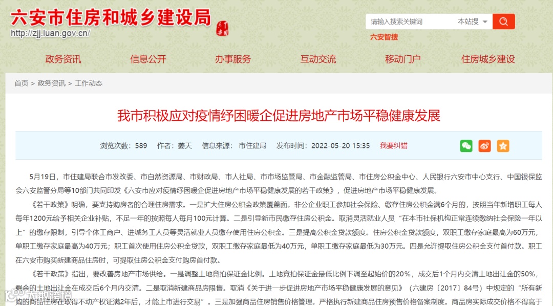 几乎就在LPR下调的同时,5月20日,六安市住房和城乡建设局等10部门印发六安市应对疫情纾困暖企促进房地产市场平稳健康发展若干政策的通知: