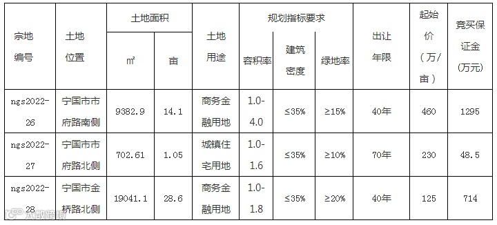 ngs2022-26号地块位于宁国市市府路南侧,出让面积9382.9平方米;ngs2022-27号地块位于宁国市市府路北侧,出让面积702.61平方米;gs2022-28号地块位于宁国市金桥路北侧,出让面积19041.1平方米。以上三宗地块的建设要求需严格按照宗地规划设计条件执行(详见出让文本)。
