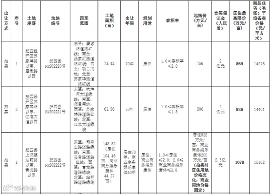 肥西县FX202220号、FX202221号地块采取“投报高品质住宅方案”的拍卖方式。即:“价高者得+投报高品质住宅建设方案+摇号”。