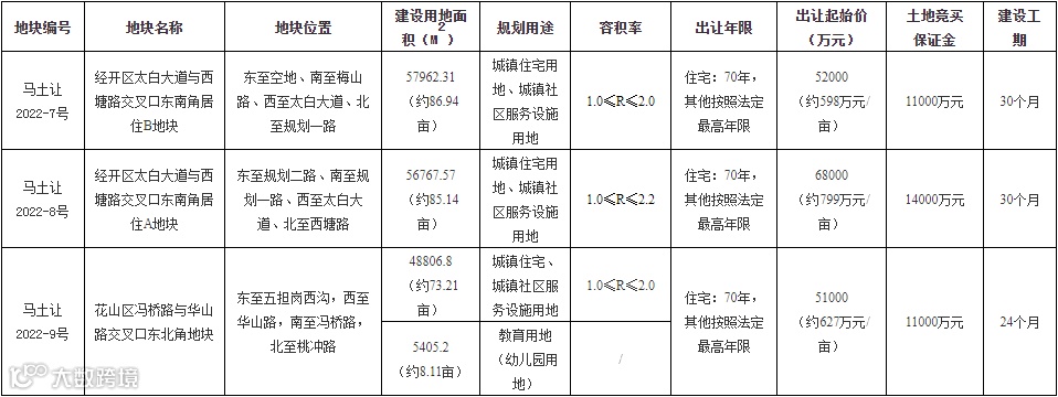 (1)马土让2022-7号地块:地块范围内建筑物拆至地表,土方、垃圾等由受让人自行按规定处置。出让范围内沿太白大道高压杆线暂时保留(若竞得人不使用,由开发区管委会1个月内移除),其他杆管线及地下管网由受让人勘验后妥善处置。外部条件(道路、水、电、气等)均以现状为准。