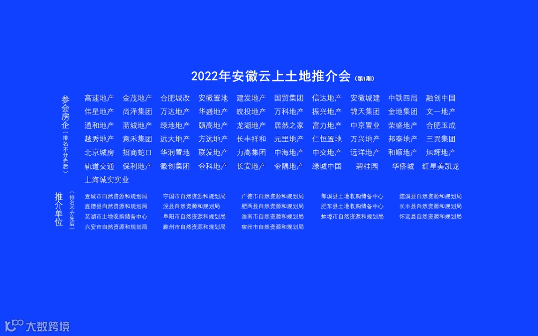 本次2022年安徽省云上土地发布会第一期是我们首次以云上发布的形式服务于政府和开发商,有幸邀约了18个县市参加(8个地级市、2个县级市、8个县城),共计推地约百宗,邀约开发商60余家,计划分上午场跟下午场,欢迎大家积极参与留言互动。