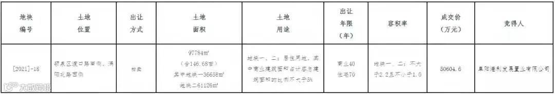 12月17日,阜阳市港利发展以345万/亩,摘得颍泉区【2021】-18号地块,成交总金额约50604.6万元,楼面价2352元/m²,溢价率15%!