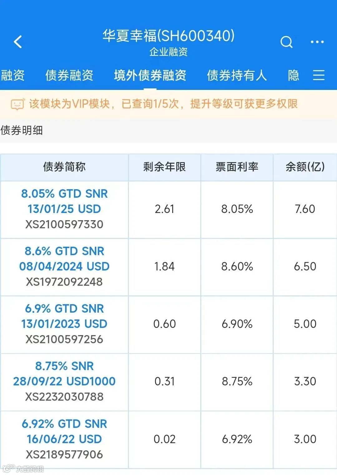 三、数据显示,目前华夏幸福共存续5只美元债,存续规模有25.4亿美元,其中有11.3亿美元的美元债需要在半年内偿还,然而这仅仅是华夏幸福债务的冰山一角。