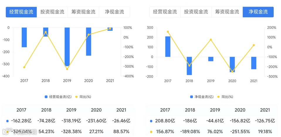 更可怕的是,华夏幸福的经营性现金流和净现金流,从2018年以后就一直是负数,这意味着这家房企极度缺乏可灵活使用的资金,所有资金流都是基于各类融资,当通过腾挪土地借新还旧的套路,因销售问题出现危机后,文初的债务危机便爆发了。
