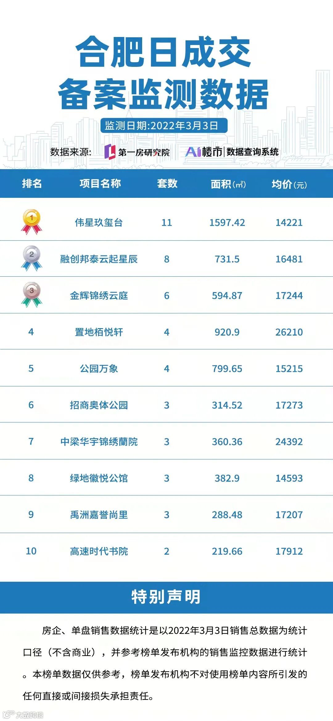 导读:3月3日(星期四)合肥市区备案住宅类商品房73套,备案均价18066元/㎡。单日楼盘备案TOP10中,第一名