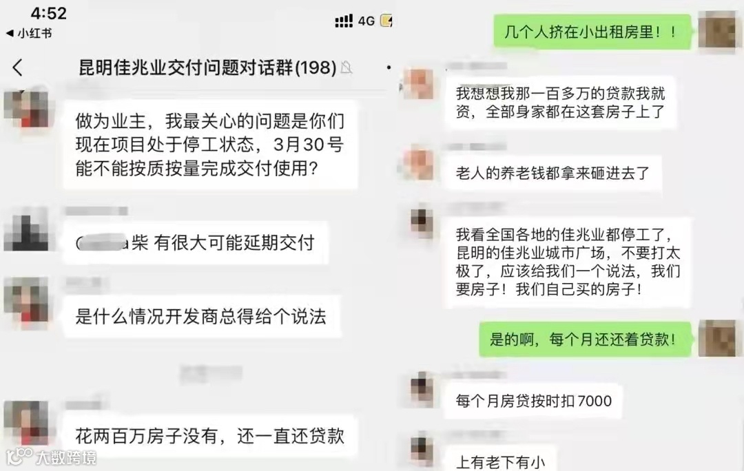 网友:我们是昆明佳兆业城市广场业主。昆明佳兆业城市广场项目现A、G两个地块开盘,按照开发商的宣传“住宅均价约16000元/㎡。G地块交由云南明志房地产开发有限公司开发,五证齐全,于2019年9月开盘,预计于2022年3月底交付,当前房源几乎售罄。A地块交由昆明展源房地产开发有限公司开发,五证齐全,其中规划为住宅的3栋和4栋于2020年6月开盘,预计于2022年9月交付,当前房源几乎售罄。项目A地块规划为公寓的2栋于2021年4月正式发售,截止2021年10月底房源几乎售罄。”但是项目现在彻底停工,园林、绿化、市政、管网、装修皆未完成。据业主了解施工情况,就算当前完全复工,项目整体也不可能按时交房。
