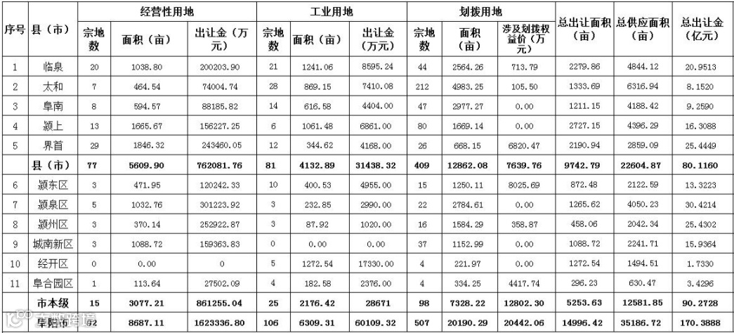 其中,商住用地颍州区计划供地1153亩,颍泉区1438区,城南新区1095亩,颍东1361亩,经开区1135亩,阜合产业园142亩。