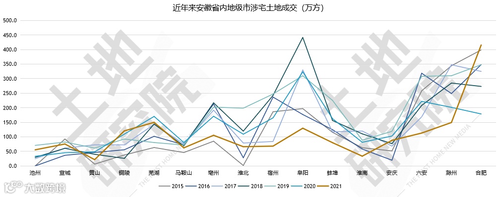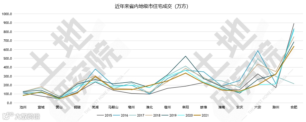 2、除池州、宣城、铜陵、合肥外,其他城市较2020年均有不同程度下滑,其中阜阳跌幅达60%、合肥涨幅达133%;仅合肥、滁州、芜湖、六安、阜阳、亳州、铜陵成交超百万方;