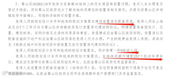 根据要求,地块竞得人需代建安置房、一所9班幼儿园、停车位等。