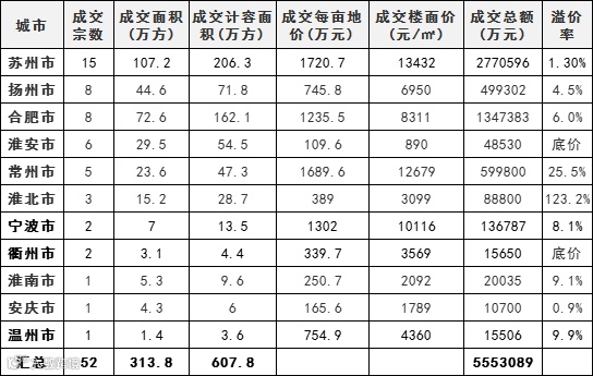 浙江、江苏、安徽省本周(09.13-09.18)共成交52宗涉宅用地(含商住,下同),其中江苏成交34宗、浙江5宗、安徽13宗。