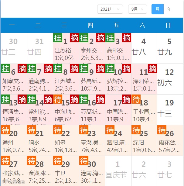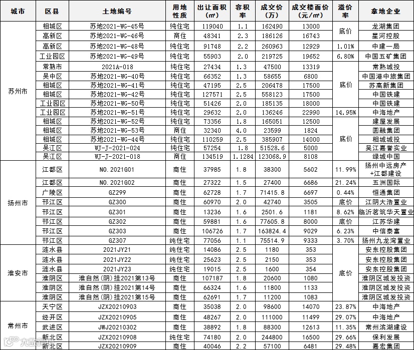 9月13日-9月18日江苏省共成交34宗涉宅用地,其中苏州“两集中”成交15宗,扬州成交8宗,淮安成交6宗,常州成交5宗。
