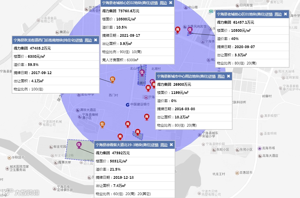 纵观地块周边历年土拍,得力集团在周边1公里以内,已竞得5宗地块,可见“得力集团”深耕宁海县的信心。